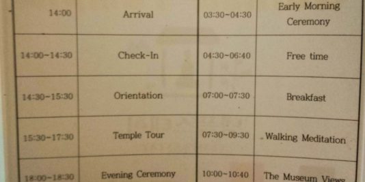 La formule du Temple Stay me paraît plus adaptée à un première découverte avec le bouddhisme et la méditation. Le format est court et les contraintes restent tout de même très modérées. A Guinsa, nous avions des sessions de méditations nombreuses, mais variées, notamment avec une session de méditation en marchant. Surtout, chaque groupe avait l’occasion d’échanger avec un moine autour d’un thé. Pour nous, le moine en question était une femme, et elle faisait preuve d’une ouverture d’esprit vraiment appréciable. On pouvait poser lui poser des questions sans soucis, et elle y répondait en tout franchise, sans langue de bois. Cette dégustation de thé, plus pour la conversation qu’autre chose, reste pour moi le meilleur moment du séjour.